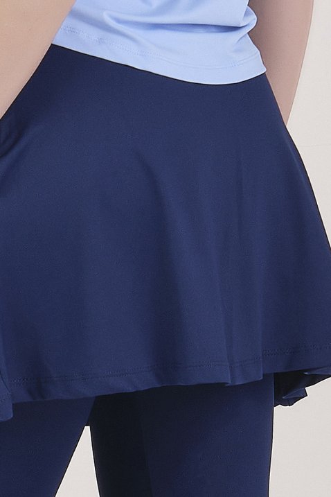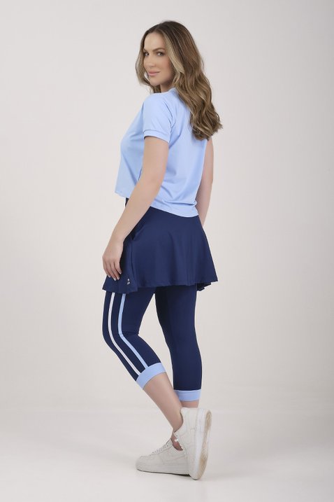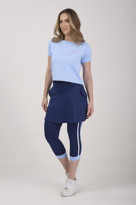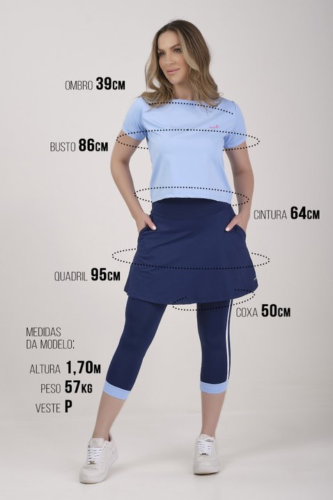 Esta saia calça corsário é um verdadeiro destaque, com detalhes elegantes em galão nas cores branca e azul claro que conferem um toque de sofisticação à sua aparência. Feita com um tecido de poliamida leve e macio, esta peça proporciona conforto incomparável e, o melhor de tudo, possui proteção solar integrada para manter sua pele protegida dos raios UV prejudiciais.