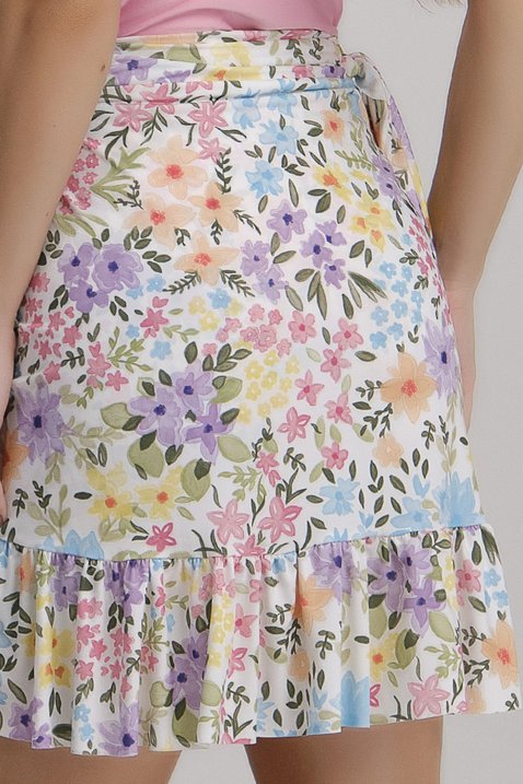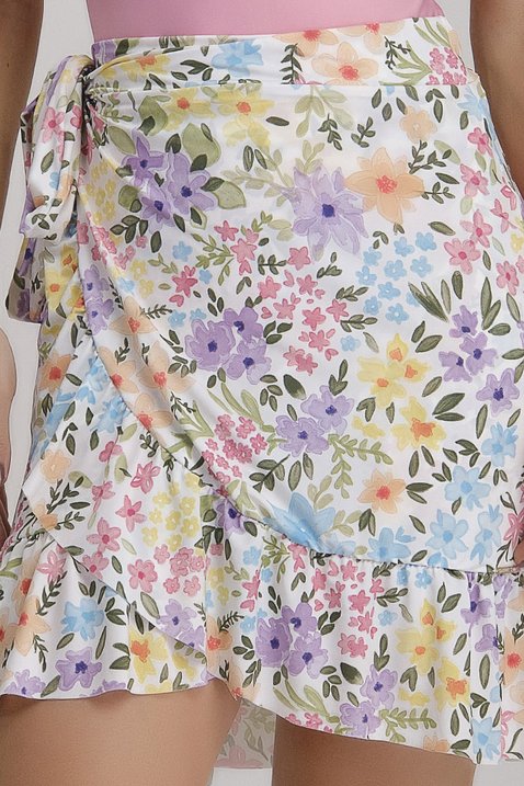 👗 Modelagem feminina: saia transpassada com babados, que valoriza a silhueta e traz movimento ao look.